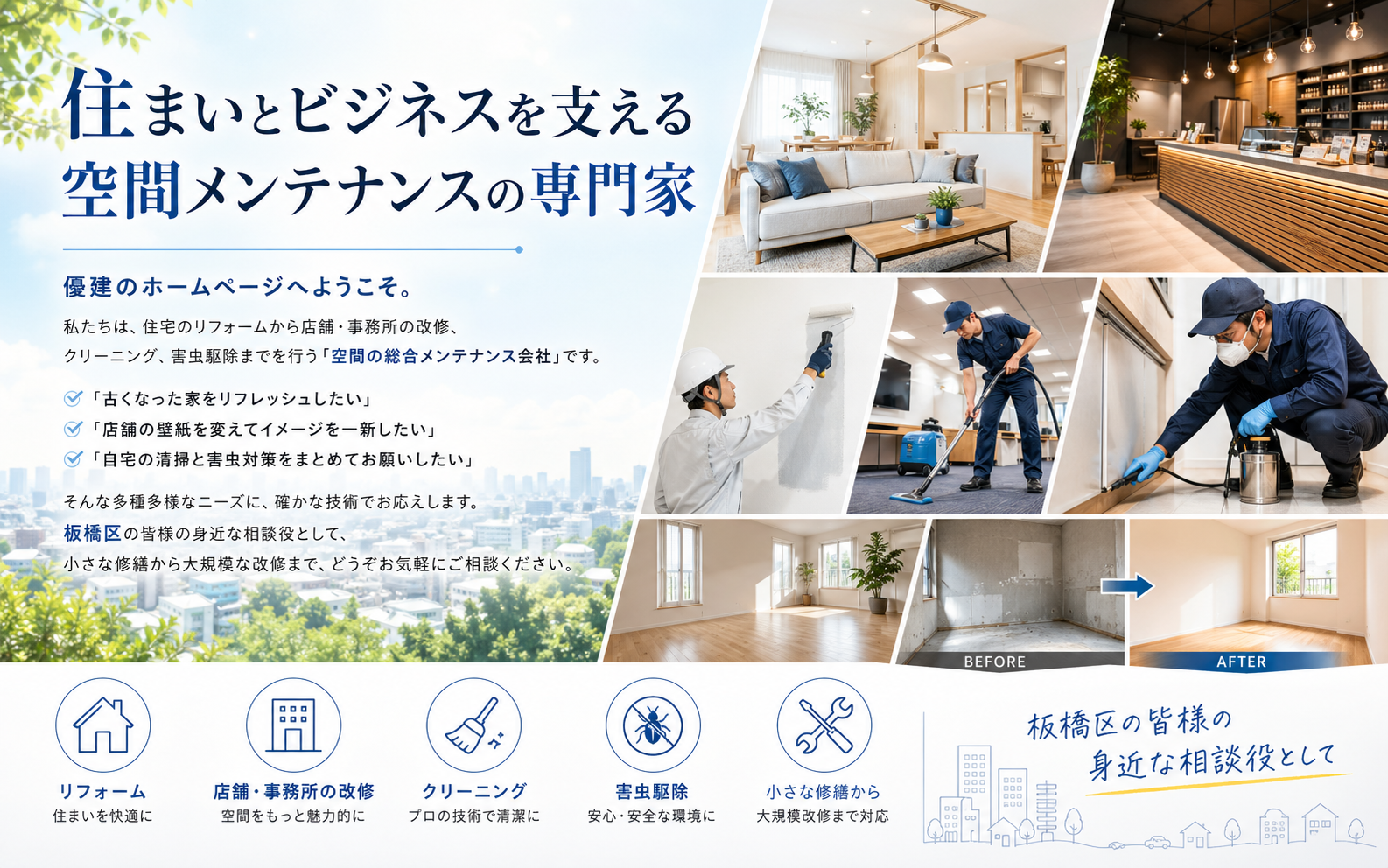 ■ リフォーム・原状回復 ・壁紙・床材の張替(クロス・CF・フローリング) ・退去後の原状回復工事一式(スピード対応) ・住宅・店舗の小規模修繕 ・アスベスト含有建材の安全施工 ■ ハウスクリーニング ■ 害虫駆除・環境衛生 |