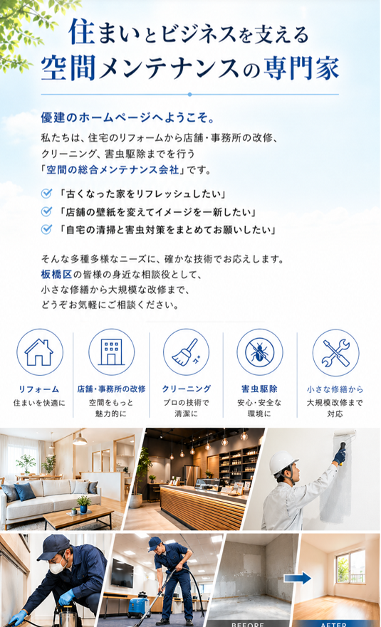 ■ リフォーム・原状回復 • 壁紙(クロス)・床材(CF・フローリング)の張替 • 退去後の原状回復工事一式(スピード対応) • 住宅・店舗の小規模修繕 • 石綿(アスベスト)含有建材の安全な取扱い・施工 ■ ハウスクリーニング • 空室清掃・入居前クリーニング • エアコン分解洗浄・水回り集中清掃 • マンション・アパート共用部の定期清掃 • 接客業10年の経験を活かした丁寧な現場対応 ■ 害虫駆除・環境衛生 • 不快害虫(ゴキブリ・ハチ等)の駆除・防除 • ネズミ等の侵入防止対策・衛生管理 • 賃貸物件の入居前防虫施工 |