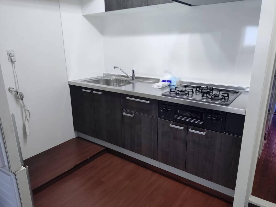 築年数の経過により設備の老朽化が見られたキッチンを、使い勝手とデザイン性を重視し全面リフォームしました。収納力のある引き出し式キャビネットと、清掃性の高いステンレス天板を採用することで、日常的に使いやすいキッチンへ改善。 また、ガスコンロやレンジフードも一新し、安全性と機能性を向上させています。落ち着いたダークトーンの面材を採用することで、空間全体に統一感のあるスタイリッシュな印象に仕上げました。